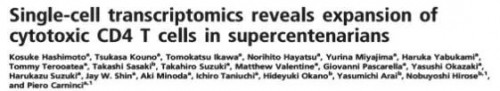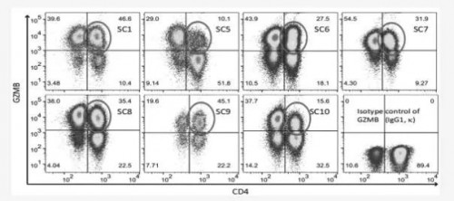 他找到一些世紀長壽老人,所謂的長壽就是年齡在110歲以上,而且還健康無疾病的人。他用最先進的免疫細胞檢測技術,發現這類長壽老人都有一個共同的特點。這些老人除了長壽,還有一個相同的免疫趨勢,那就是都高表達CD4+殺傷性T細胞。下圖標圈里的細胞亞群就是這個CD4+T細胞。