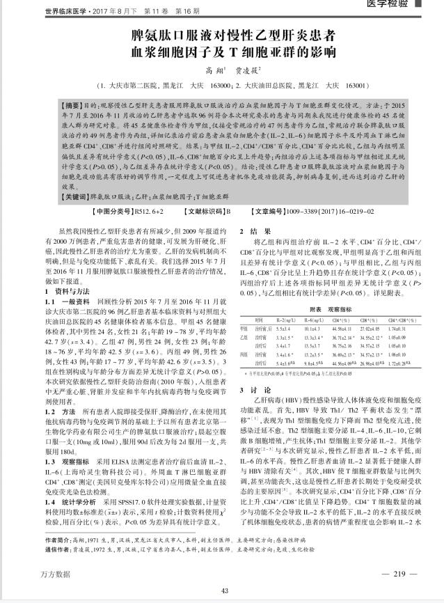 2017年8月下 第11卷第16期 世界臨床醫學雜志,黑龍江大慶市第二醫院及大慶油田總醫院,發表的《脾氨肽口服溶液對慢性乙型肝炎患者血漿細胞因子及T細胞亞群的影響》論文種成功論證了脾氨肽口服溶液治療慢性病毒性肝炎的臨床具有顯著意義,并得出結論——脾氨肽口服溶液治療慢性病毒性肝炎值得臨床推廣。