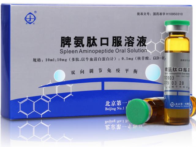 北京第一生物化學藥業有限公司(簡稱北京第一生物)的產品脾氨肽口服溶液是從健康動物脾臟中提取,主要成分用健康牛脾臟為原料,制成的含多肽氨基酸和多核苷酸混合物的溶液。目前臨床未發現明顯副作用。脾氨肽口服溶液為免疫調節藥,主要用于過敏性疾病及慢性乙型肝炎的治療。本品具有雙向免疫調節作用,可增強或抑制體液免疫和細胞免疫功能。異硫氰酸免疫熒光法表明,本品可以增加輔助性T細胞數。可有效的緩解一些肝炎帶來的各種癥狀。