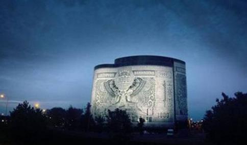 紙幣建筑:位于立陶宛的考納斯,建于1925年,以1000立體紙幣為建筑模型進(jìn)行的設(shè)計(jì),形狀是一個(gè)稍微圓形的構(gòu)架,通過(guò)特殊的瓷漆噴上1000紙幣的圖案,被稱為“1000紙幣公司”。