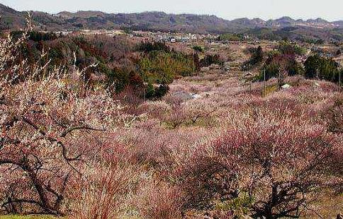 梅花和櫻花同屬薔薇科李屬植物,二者與日本國民的生活密不可分,并對日本園林綠化發揮著巨大作用,春天的賞櫻和賞梅是日本最熱鬧的活動之一。在日本,群馬縣梅樹的產量僅次于和歌山縣,位列全國第二,在日本東部名列第一,秋間梅林就是其中最大規模的梅林之一。秋間梅林是指位于秋間川上游穿過安中市丘陵地帶的梅樹林,總面積50萬平方米,擁有35000多棵梅樹。在二月和三月,梅樹的葉子還沒來得及長出來,但是已經抽出幾朵五瓣花來,花朵的顏色大多是白色,也有紅色和淺紅色的。