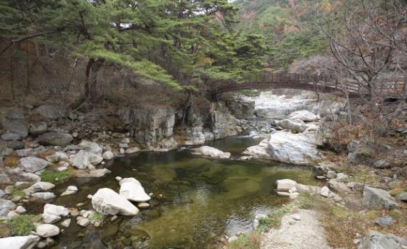 從伽倻山國立公園入口處到海印寺4公里長的溪谷稱為紅流洞溪谷,因為秋天的時候這里的楓葉紅得連溪水都被映紅了,所以得名。據說崔致遠(號孤云)先生曾在此居住,崔致遠是新羅(BC57-AD935)人,曾在唐朝留學,回國后為國效力,但痛慨于國政紊亂,遂來此隱居,與詩共度余生。紅流洞溪谷堪稱是伽倻山的第一景,一年四季的景色各不相同。春天杜鵑花和山踟躅花怒放,夏天溪谷中的千年老松與闊葉林郁郁蔥蔥,清澈的流水沿溪谷歡快地流淌。秋天周圍的松樹林和闊葉林與楓樹相得益彰,更襯托出楓葉紅似二月花之美。