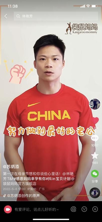 蘇炳添作為運動員,在妻子孕期和孩子的養育上長期缺席,讓他對妻子有更多愧疚和感恩。所以這次母親節,蘇炳添與袋鼠媽媽也是一拍即合,從未在母親節公開場合發聲的他,這次母親節發出了“或許我是別人眼中的蘇神,但是我只是你那個努力做到最好的老公”的宣言。